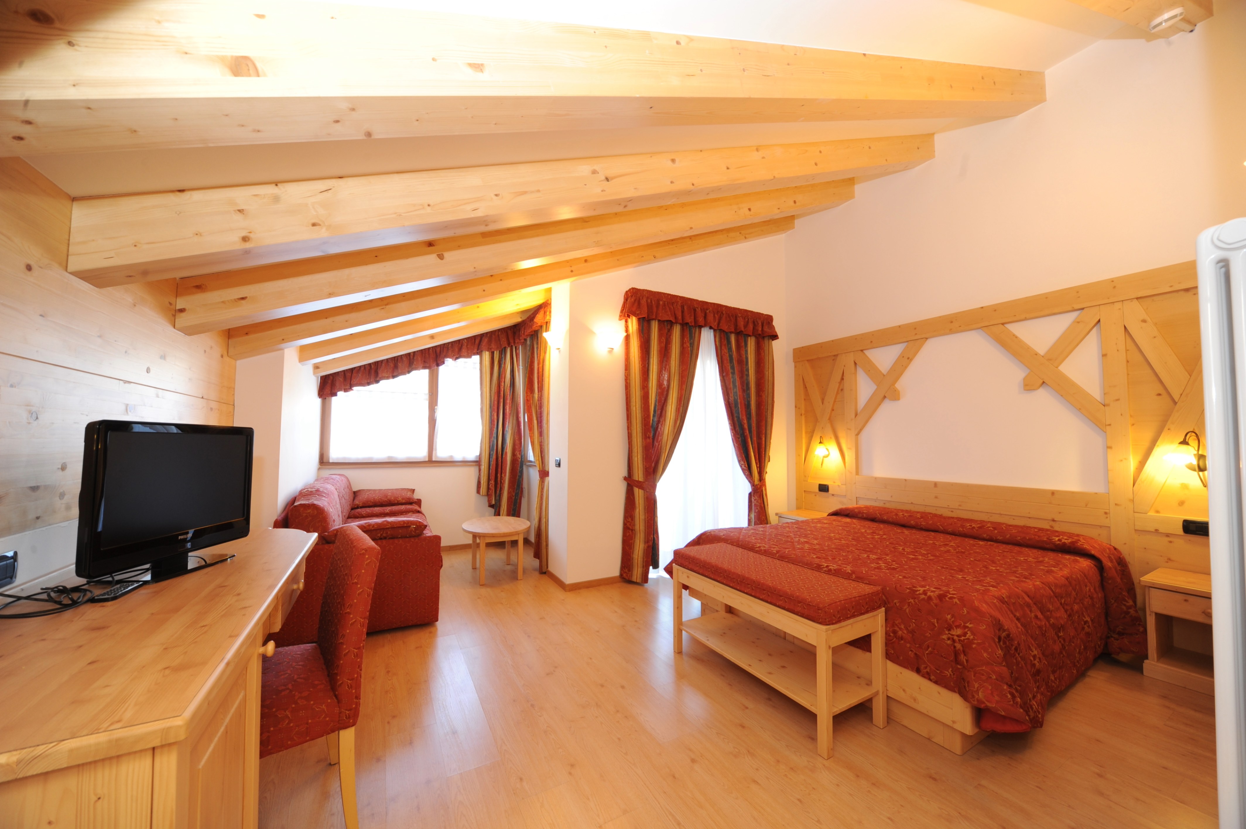 Ampia e accogliente, questa camera in stile alpino è realizzata con legno di abete rustico, che crea un ambiente caldo e raffinato, evocando il fascino autentico delle tradizionali baite di montagna. Con una superficie che varia dai 22 ai 25 mq, la stanza è progettata per garantire spazio e comfort, risultando ideale per gruppi di tre adulti o famiglie composte da quattro persone.